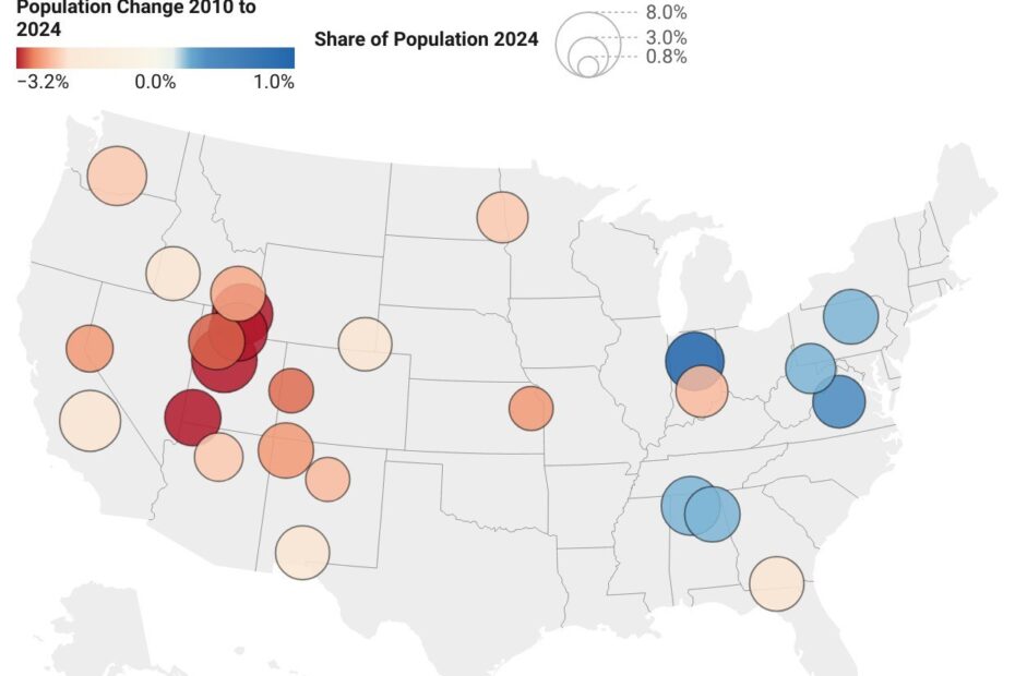 A similar rebalancing is visible in places like Farmington, NM (-2.6%) and Pocatello, ID (-2.5%)—both metros where job cycles and migration can be volatile. In smaller cities like these, a few shifts in major employers or changes in who moves in and out can tilt the age mix quickly.